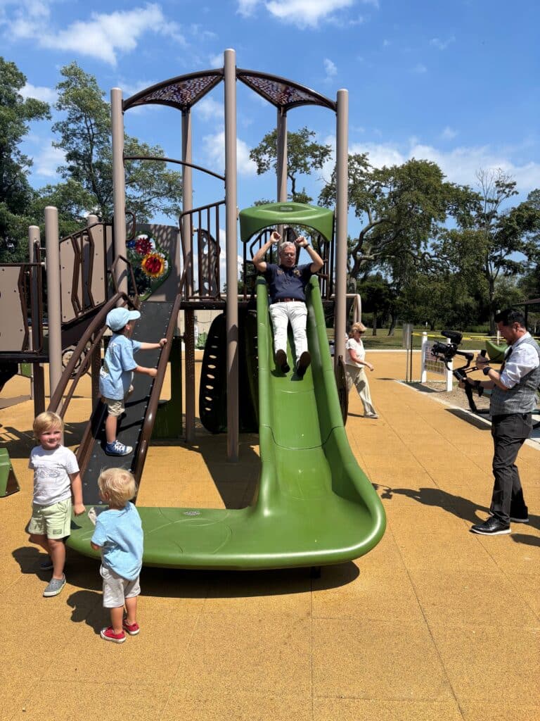 Legislator Flotteron tries out the new slide (Credit – Office of Legislator Steve Flotteron)