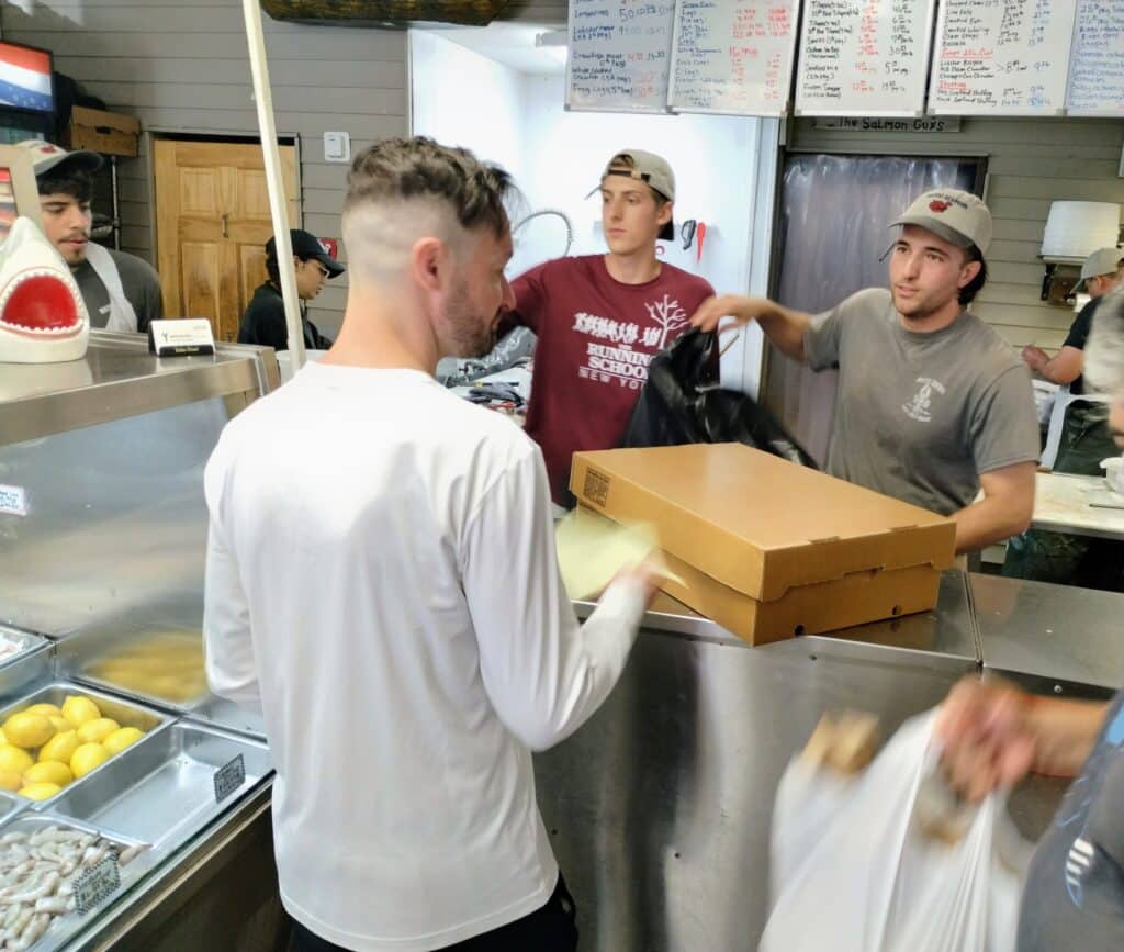 Around one side of the storefront is a constant flow of large box trucks and vans pulling in to buy wholesale. These customers, many restaurant owners, pull in traveling anywhere from Montauk to Manhattan. On the opposite side of the structure is local fishermen pulling in to sell off their daily catch to the store. It’s an amazing conveyor belt and full-circle type of operation to watch.
