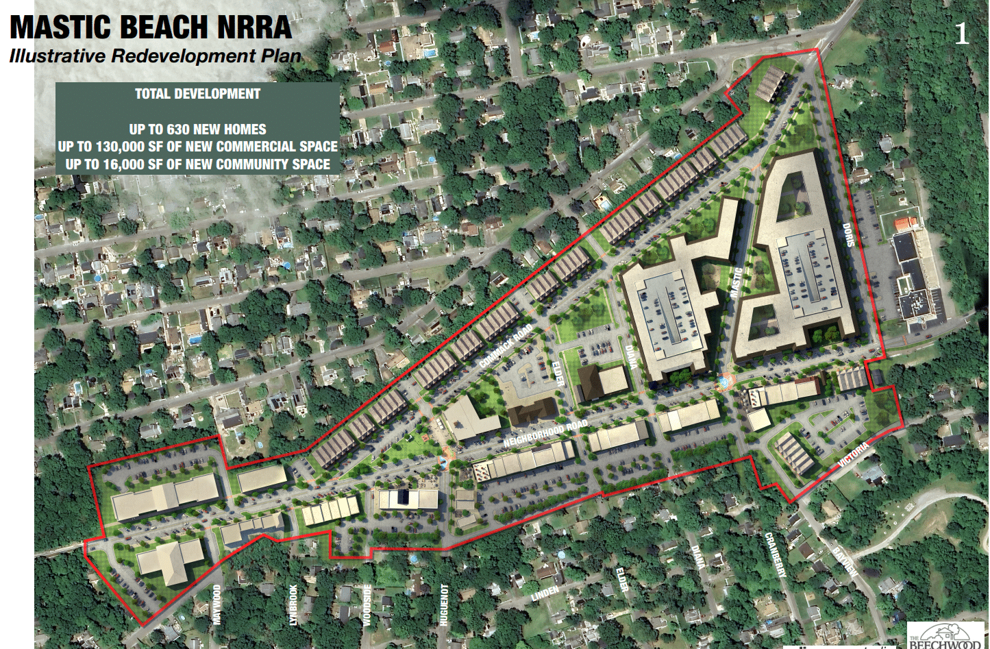 The redevelopment area is a triangular zone of about thirty-seven acres and 140 parcels. It begins just west of the split between Neighborhood and Commack and continues east to Doris Drive and northeast towards Commack Road. Victoria Place and Linden place bound the area to the south.