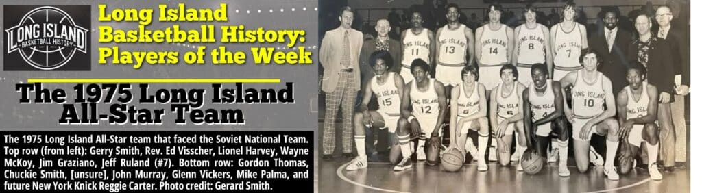 The 1975 Long Island All-Star team that faced the Soviet National Team. Top row (from left): Gerry Smith, Rev. Ed Visscher, Lionel Harvey, Wayne McKoy, Jim Graziano, Jeff Ruland (#7). Bottom row: Gordon Thomas, Chuckie Smith, [unsure], John Murray, Glenn Vickers, Mike Palma, and future New York Knick Reggie Carter. Photo credit: Gerard Smith.