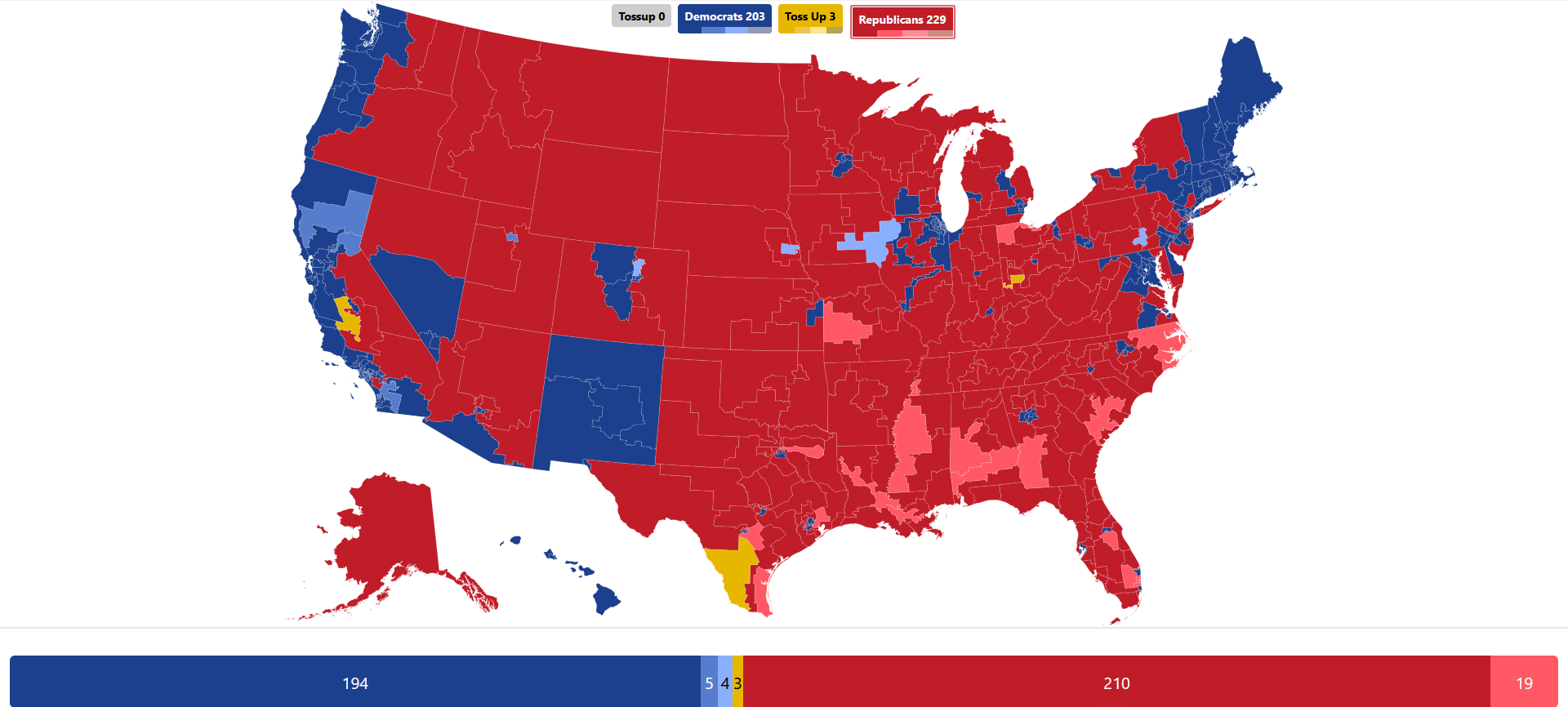 Under this circumstance, the GOP makes a net gain of ten seats for a total of 228 seats, with three Toss Ups that could go either way – a much rosier picture than their current razor-thin majority of 220 seats.