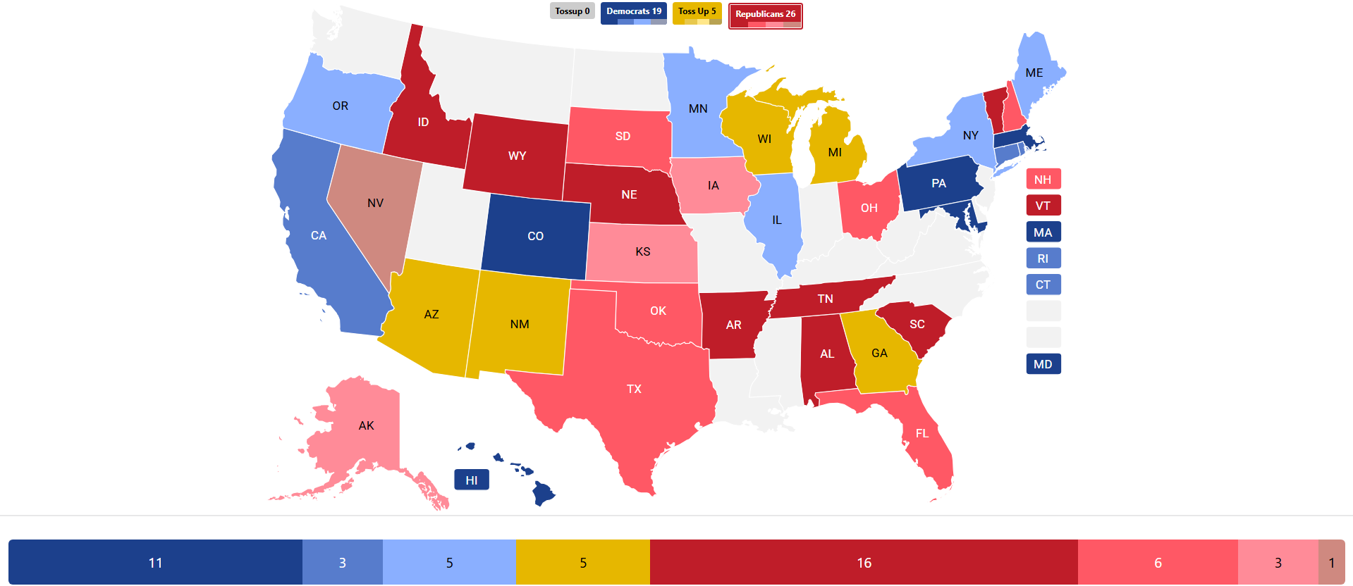 The Messenger identifies five states as Toss Ups, with another eighteen rated at varying levels of competition. Only the staunchest conservative or liberal states we rate as Safe for either party, as well as a few states featuring key incumbents who appear poised to cruise to victory as of press time.
