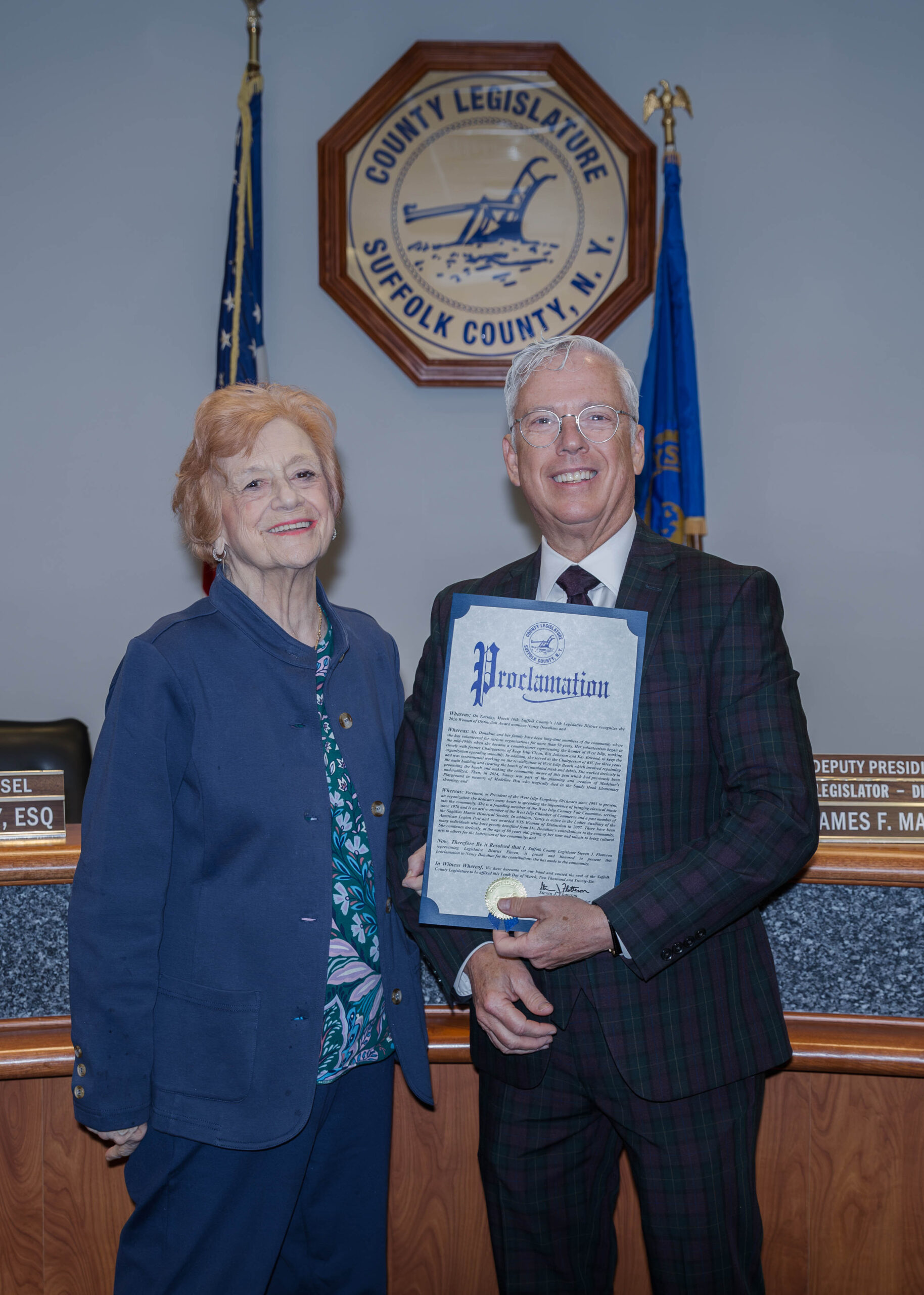 Legislator Steven J. Flotteron (R-Brightwaters) presents Nancy Donahue with the 2026 Suffolk County Woman of Distinction Award for the Eleventh Legislative District.